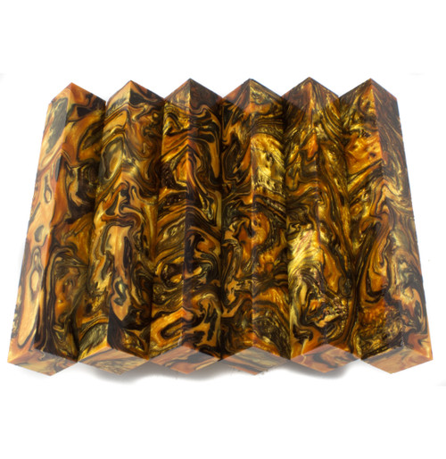 I bought this after loving the antique copper so much. This was no disappointment. The blank has gold metallic swirl with a black background. The blank sparkles as you rotate it. Both this and the antique copper are very sophisticated blank designs. It will go well with higher end pen kits. Issues with my order were addressed above and beyond what I expected. In the end, I received beautiful antique gold blanks that I can't wait to turn.